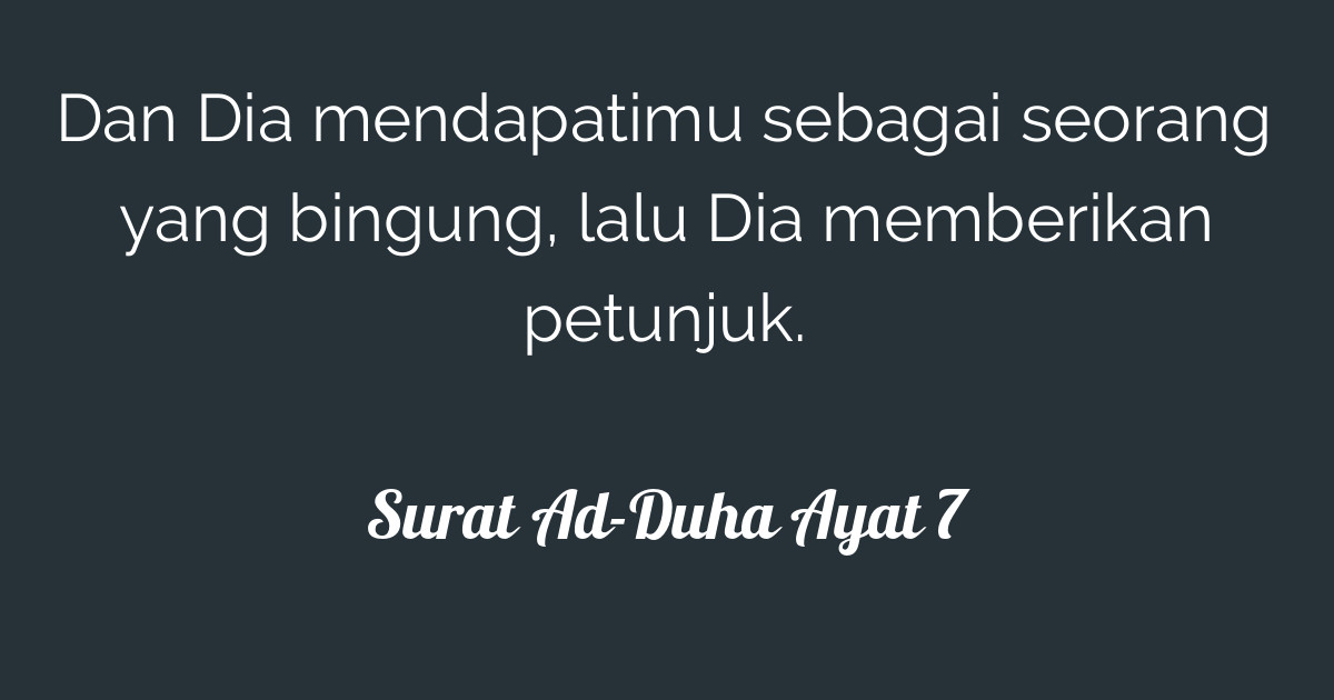 Kemudian allah memberikan petunjuk kepadanya. 7, dan dia mendapatimu sebagai seorang yang bingung, lalu dia memberikan petunjuk, Dan bukankah dia juga mendapatimu sebagai seorang yang kekurangan, lalu dia memberikan kecukupan … "dan dia mendapatimu sebagai seorang yang tersesat, lalu dia memberikan petunjuk". Dan dia mendapatimu sebagai seorang yang bingung, lalu dia memberikan petunjuk, share.